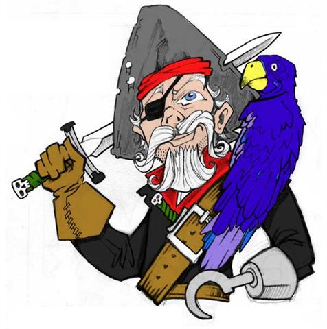 | Retired pirate Commodore Stavro with parrot. A Norwegian Blue, naturally. Many thanks to Chris Pallace for the marvelous drawing |