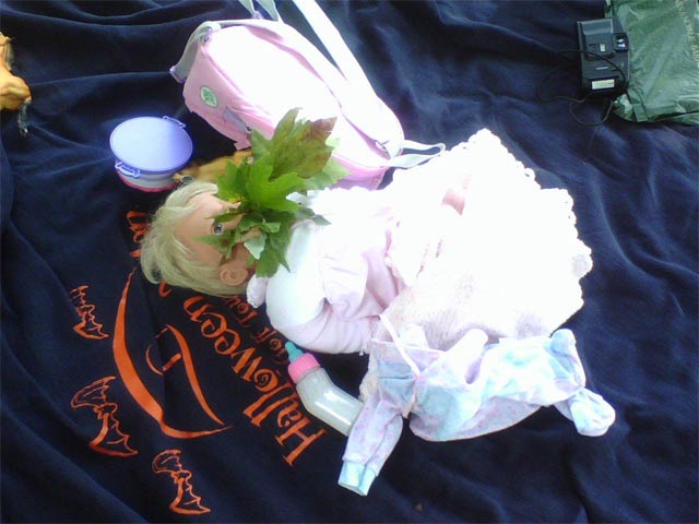 | True story: I saw this baby doll with leaves stuffed in its mouth at a family reunion in 2006. I have no idea who did this or why. But I just HAD to take a picture of it. |