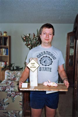 | This one is from the mid-1980s. Scary, right? I made the "Baby On Board" thing for some local radio contest. The only thing that I remember about it is that I didn't win. I wish that I still had that T-shirt! |