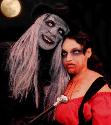| Bill Mills (known at Mad Music for his Zombie song "I'll Eat Yer Brain") in "ZomBill" make-up on Halloween 2011 (with "Zombette", model name unknown) |