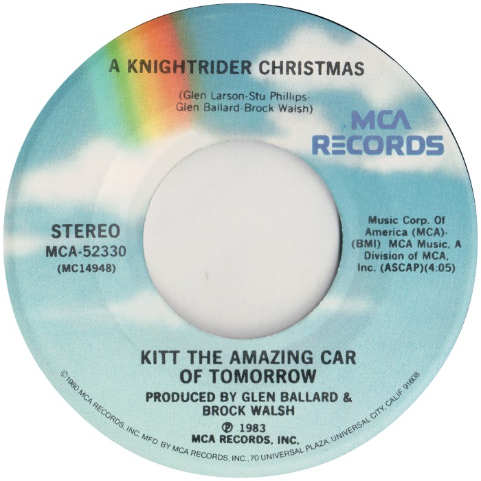• In 1983 the theme music was released on a 45rpm during the holiday season. Produced by Glen Ballard & Brock Walsh under the performer title "Kitt The Amazing Car of Tomorrow" with narration by William Daniels & David Hasselhoff but mostly by an unknown performer. This single was titled "A Knightrider Christmas" on MCA Records 52330. (MarlinsGirl)