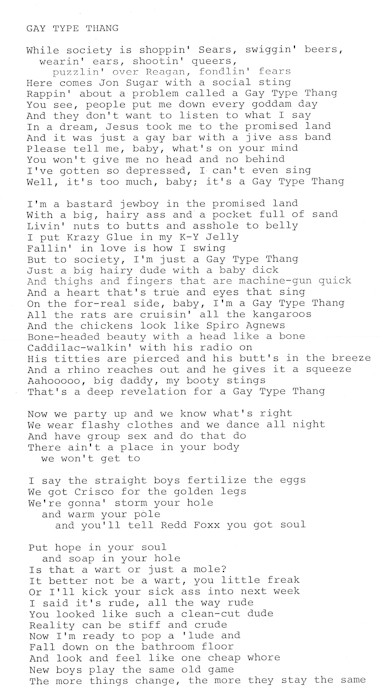 While society is shoppin' Sears Swiggin' beers, wearin' ears Shootin' queers, puzzlin' over Reagan and fonding fears Here comes Jon Sugar with a social Rappin' 'bout a problem called a gay type thang
