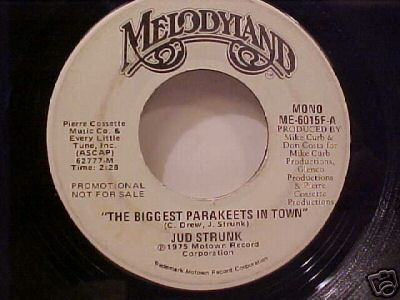 Well, picture on their wedding night, When hubby, dear, turns off the light, And wakes in the mornin' with a frown..... As he goes to caress her, He sees them on the dresser... The biggest parakeets in town! (She's really got 'em, boy!) The biggest parakeets in town! (They're enormous!) (Dave AuJus) |