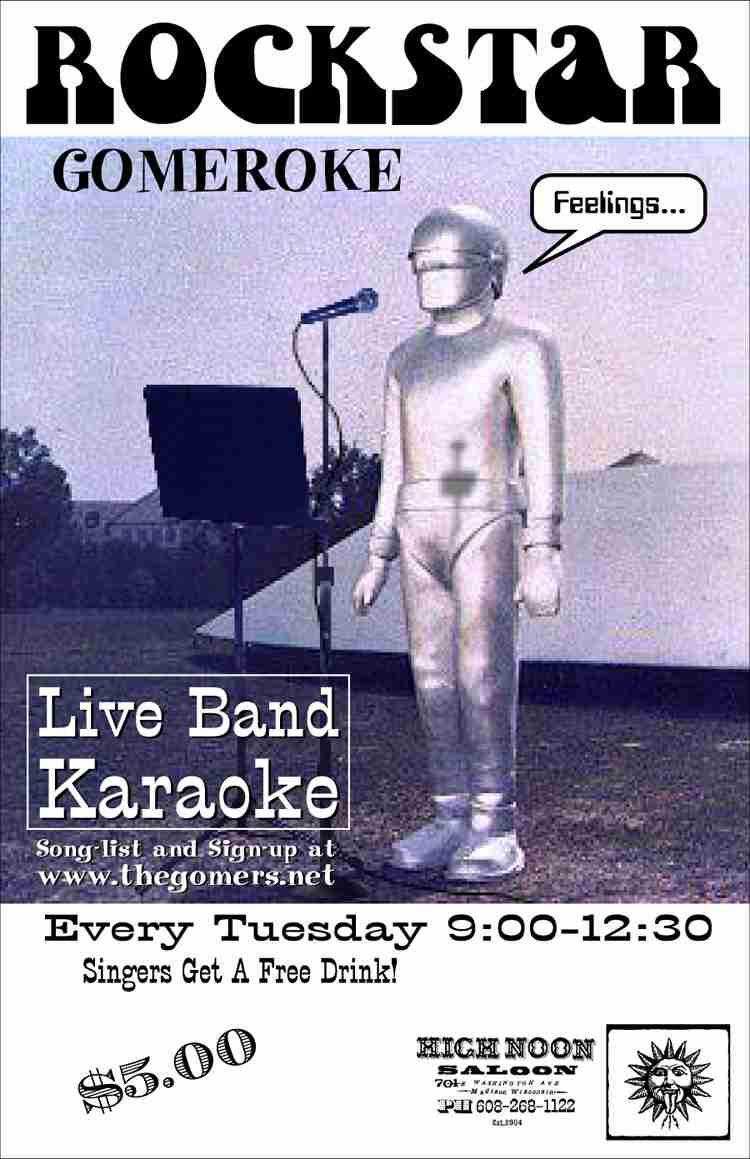 | The Gomers' ROCKSTAR GOMEROKE live band karaoke show repeats every Tuesday night at 9pm and the 1st & 3rd fridays of each month at Happy Hour at the High Noon Saloon (www.high-noon.com) in Madison, WI (Mr. Beefy) |